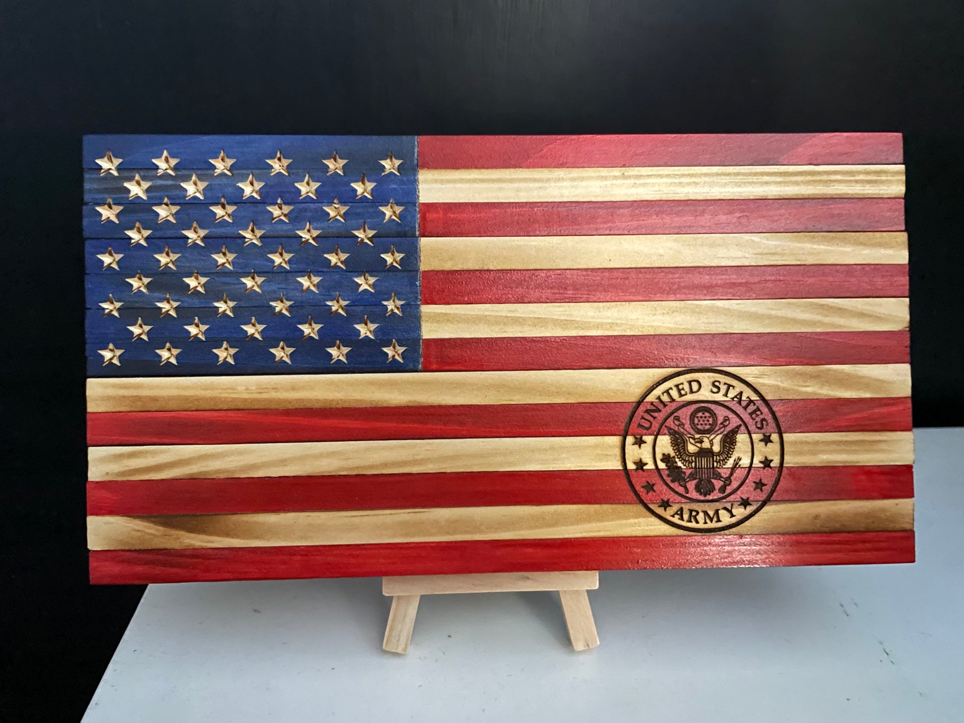 Handcrafted desktop wooden US Army flag measuring 5.5" x 9.5". Each flag is made from hand-selected, locally sourced wood to ensure a high-quality product, and all are carved by hand to give it a rustic look. They are the perfect-sized accent piece, made to be proudly displayed. The US Army seal is laser engraved. Customization is available for an additional cost.
